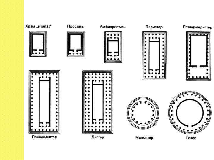 Древнейшим типом каменного архаического храма был так называемый "храм в антах". Он состоял из небольшой целлы с двускатной крышей. Её фасад был оформлен выступами боковых стен - антами и украшен двумя колоннами. по этому типу были построены сокровищницы в Дельфах и Олимпии. Целла (латинск. cella, греческ. σηκός) — в древнегреческих и римских храмах внутреннее помещение, т. е. заключенная в четырех стенах часть здания, собственно святилище, перед входной дверью в которую находился портик с четным числом колонн и которое в периптерических храмах было, кроме того, окружено со всех сторон колоннадой
