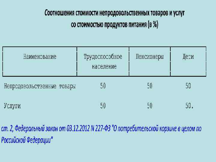 Расходы на товары и услуги теперь "привязаны" к стоимости продуктов и должны составлять ровно половину от этой суммы: 25 % отводится на товары и столько же - на услуги. При этом конкретного списка товаров больше не существует, человек сам должен решить, что ему необходимо в первую очередь: ботинки, пальто, постельное белье, школьно-письменные принадлежности, предметы личной гигиены или лекарства. 6 слайд