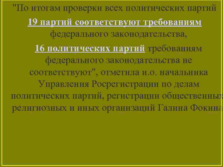 "По итогам проверки всех политических партий 19 партий соответствуют требованиям федерального законодательства, 16 политических партий требованиям федерального законодательства не соответствуют", отметила и. о. начальника Управления Росрегистрации по делам политических партий, регистрации общественных религиозных и иных организаций Галина Фокина.