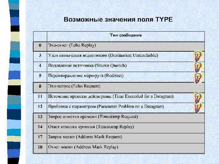 Формат заголовка и ICMP-сообщения типа «ответ о значении маски» Type=18 Checksum Code=0 Идентификатор запроса Последовательный номер Значение маски 4 байта