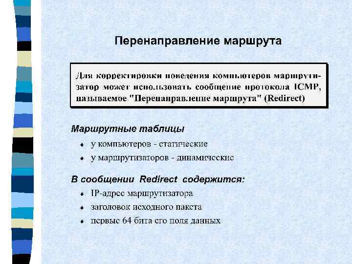 ICMP-сообщения об ошибках: n не корректируют ошибок n не могут маршрутизатору n могут теряться n нельзя посылать ICMP-сообщения об ICMPсообщениях об ошибках, но для ICMP-сообщенийзапросов - можно n ICMP сообщения можно посылать только о проблемах, возникающих при обработке первого фрагмента в сегментированном IP-пакете направляться промежуточному