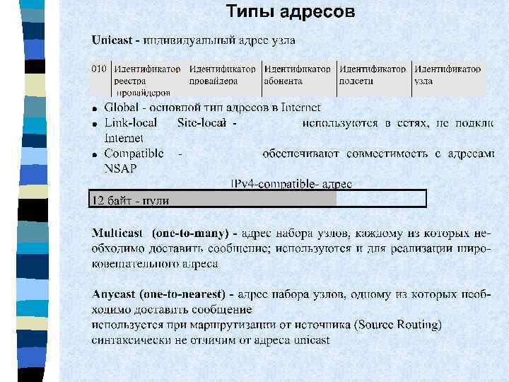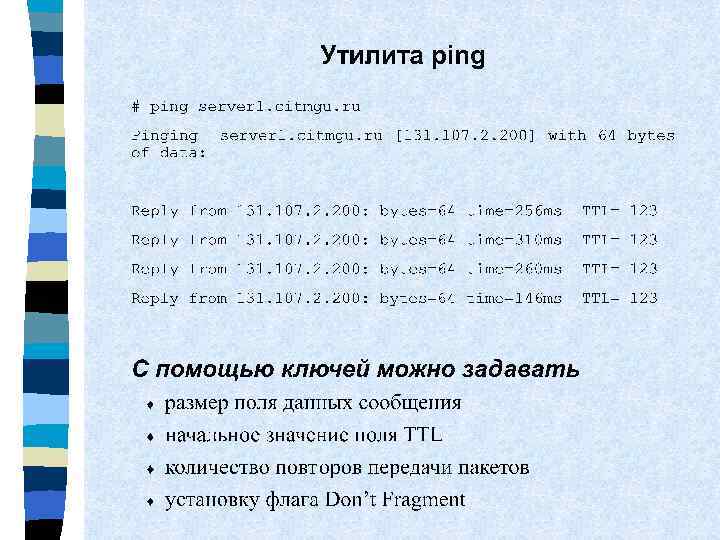 Структура заголовка IP-пакета длина Максимальная IP-пакета 65535 байтов Длина заголовка 20 (с опциями 60) байтов. PR – приоритет 000 -111 D (delay) – задержка: 0 – нормальная, 1 – малая T (throughput) – пропускная способность: -норма, 1 -высокая R (reliability) – надежность: 0 -норма, 1 -высокая Максимальное время жизни Type of service RFC 1340 и 1349 255 с telnet – 100 FTP –управление 100, данные 010 SNMP- 001 0 Только для заголовка