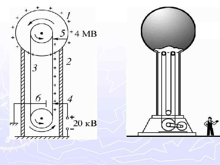 Рис. 5. 5. Зарядное устройство заряжает ленту транспортера положительными зарядами. Лента переносит их вовнутрь сферы и там происходит съем положительных зарядов. Далее они стекают на внешнюю поверхность. Так можно получить потенциал относительно земли в несколько миллионов вольт – ограничение – ток утечки. Такие генераторы существуют в настоящие время. Например, в Массачусетском технологическом институте построен генератор с диаметром сферы 4, 5 метров и получен потенциал 3 ÷ 5· 106 В. У нас в Томске очень развита ускорительная техника. Так, только в НИИ ядерной физики имеется около десяти ускорителей (генераторы различного класса). Один из них ЭСГ или генератор Ван-де-Граафа. Он изготовлен в специальной башне и на нем получали потенциал один миллион вольт.