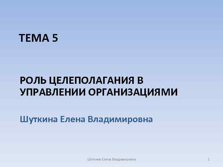 ТЕМА 5 РОЛЬ ЦЕЛЕПОЛАГАНИЯ В УПРАВЛЕНИИ ОРГАНИЗАЦИЯМИ Шуткина Елена Владимировна 1