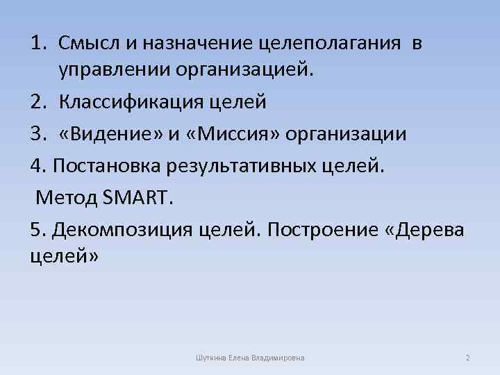 1. Смысл и назначение целеполагания в управлении организацией. 2. Классификация целей 3. «Видение» и «Миссия» организации 4. Постановка результативных целей. Метод SMART. 5. Декомпозиция целей. Построение «Дерева целей» Шуткина Елена Владимировна 2
