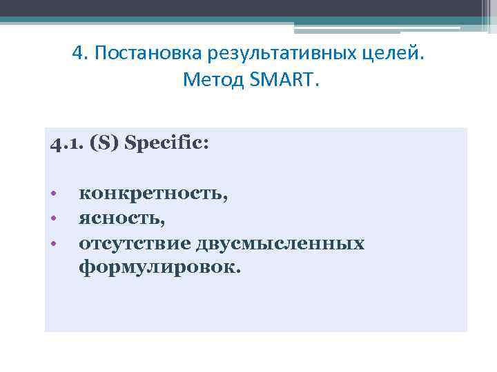 4. Постановка результативных целей. Метод SMART. 4. 1. (S) Specific: • • • конкретность, ясность, отсутствие двусмысленных формулировок.