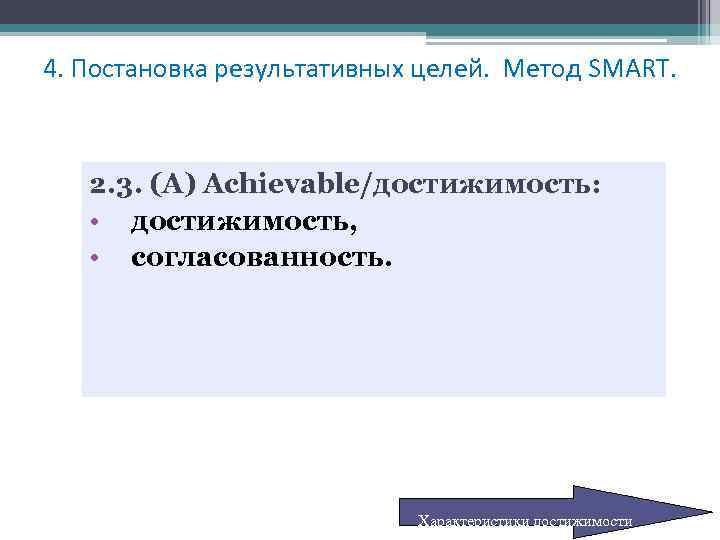 4. Постановка результативных целей. Метод SMART. 2. 3. (А) Achievable/достижимость: • достижимость, • согласованность. Характеристики достижимости
