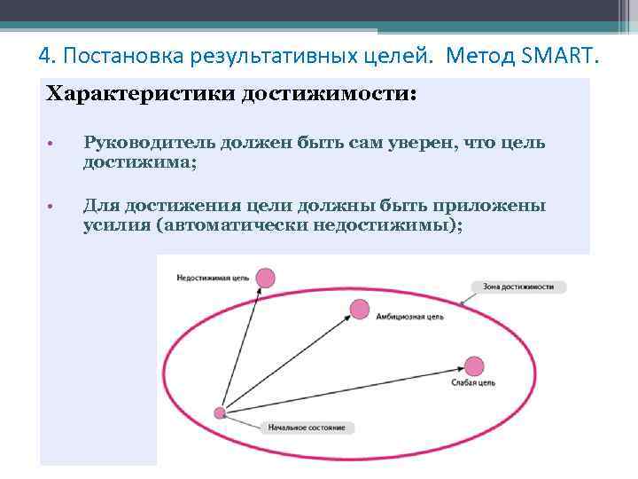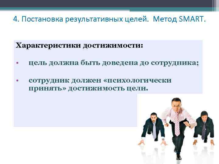 4. Постановка результативных целей. Метод SMART. Характеристики достижимости: • цель должна быть доведена до сотрудника; • сотрудник должен «психологически принять» достижимость цели.