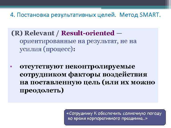 4. Постановка результативных целей. Метод SMART. (R) Relevant / Result-oriented — ориентированные на результат, не на усилия (процесс): • отсутствуют неконтролируемые сотрудником факторы воздействия на поставленную цель (или их можно преодолеть) «Сотруднику К обеспечить солнечную погоду во время корпоративного праздника…»