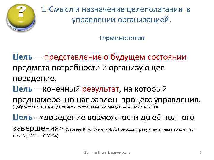 1. Смысл и назначение целеполагания в управлении организацией. Терминология Цель — представление о будущем состоянии предмета потребности и организующее поведение. Цель —конечный результат, на который преднамеренно направлен процесс управления. (Доброхотов А. Л. Цель // Новая философская энциклопедия. — М. : Мысль, 2000). Цель - «доведение возможности до её полного завершения» (Сергеев К. А. , Слинин Я. А. Природа и разум: античная парадигма. — Л. : ЛГУ, 1991 — С. 33 -34) Шуткина Елена Владимировна 3
