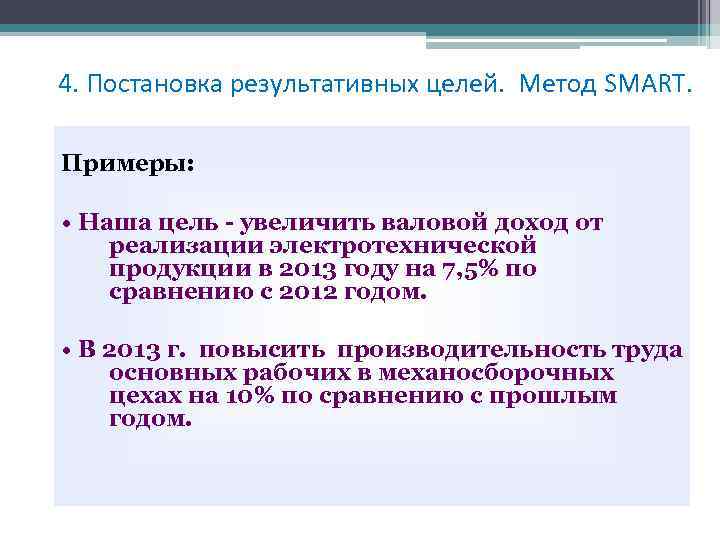 4. Постановка результативных целей. Метод SMART. Примеры: • Наша цель - увеличить валовой доход от реализации электротехнической продукции в 2013 году на 7, 5% по сравнению с 2012 годом. • В 2013 г. повысить производительность труда основных рабочих в механосборочных цехах на 10% по сравнению с прошлым годом.