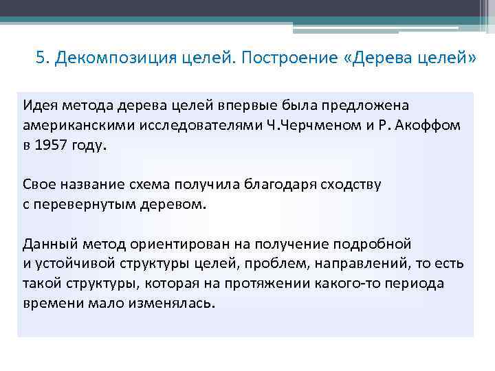 5. Декомпозиция целей. Построение «Дерева целей» Идея метода дерева целей впервые была предложена американскими исследователями Ч. Черчменом и Р. Акоффом в 1957 году. Свое название схема получила благодаря сходству с перевернутым деревом. Данный метод ориентирован на получение подробной и устойчивой структуры целей, проблем, направлений, то есть такой структуры, которая на протяжении какого-то периода времени мало изменялась.