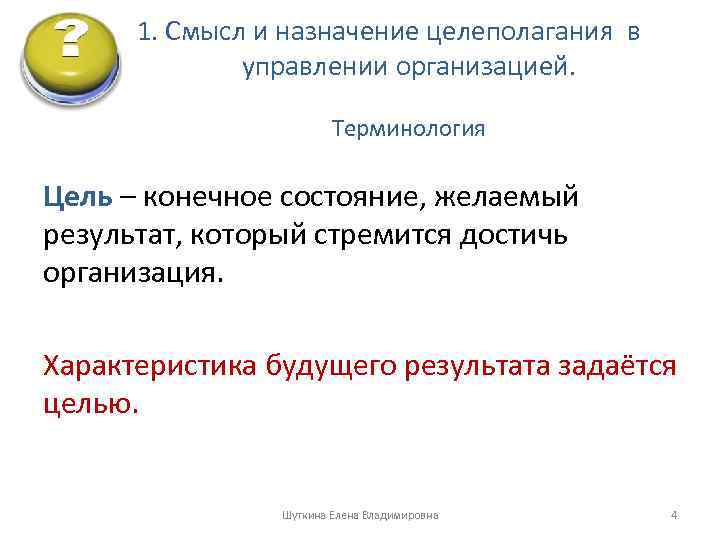 1. Смысл и назначение целеполагания в управлении организацией. Терминология Цель – конечное состояние, желаемый результат, который стремится достичь организация. Характеристика будущего результата задаётся целью. Шуткина Елена Владимировна 4