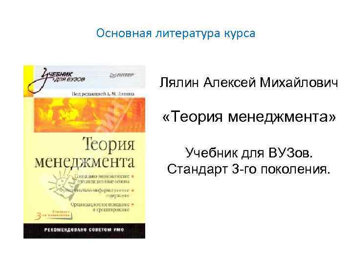 Основная литература курса Лялин Алексей Михайлович «Теория менеджмента» Учебник для ВУЗов. Стандарт 3 -го поколения.