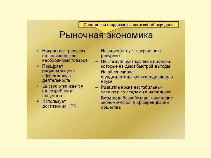Рыночная экономика Преимущества: • Эффективное использование ресурсов; • Г ибкость в приспособлении к потребностям общества; • Активное использование достижений НТР; • Свобода действий производителей и потребителей; • Способность к широкому удовлетворению потребностей. Недостатки: • Подверженность нестабильному развитию; • Отсутствие стимулов для производства общественных благ; • Неспособность к реализации крупномасштабных научнотехнических проектов; • Не гарантирует права на труд и доход; • Ориентация на запросы тех, кто имеет деньги; • Отсутствие стимулов к защите окружающей среды. Рис. 5. 4. Преимущества и недостатки рыночной экономики.
