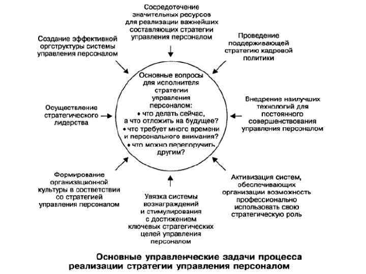 В ходе выполнения стратегии решаются три задачи: 1. устанавливается приоритетность среди административных задач (задач общего руководства), с тем чтобы их относительная значимость соответствовала той стратегии управления персоналом, которую будет реализовывать организация и система управление персоналом стратегического управления персоналом. В первую очередь это касается таких задач, как распределение ресурсов, установление организационных связей и отношений, создание информационных, нормативно-методических, правовых и других подсистем; 2. устанавливается соответствие между выбранной стратегией управления персоналом и внутриорганизационными процессами, процессами внутри системы управления персона лом, с тем чтобы деятельность организации была сориентирована на осуществление выбранной стратегии. Такое соответствие должно иметь место по следующим характеристикам организации: ее структуре, системе мотивации и стимулирования, нормам и правилам поведения, убеждениям и ценностям, квалификации работников и руководителей и т. д. ; 3. выбор необходимого и соответствующего стратегии управления персоналом стиля руководства организацией в целом и отдельными подразделениями. Успех реализации стратегии управления персоналом во многом зависит от этого.