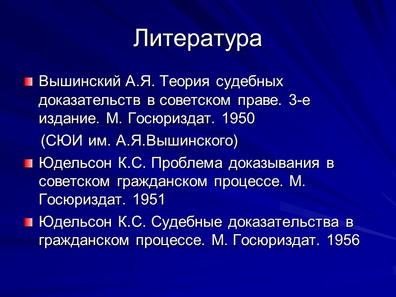 Литература Вышинский А.Я. Теория судебных доказательств в советском праве. 3-е издание. М. Госюриздат. 1950 (СЮИ им. А.Я.Вышинского) Юдельсон К.С. Проблема доказывания в советском гражданском процессе. М. Госюриздат. 1951 Юдельсон К.С. Судебные доказательства в гражданском процессе. М. Госюриздат. 1956