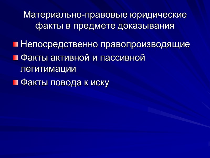 Материально-правовые юридические факты в предмете доказывания Непосредственно правопроизводящие Факты активной и пассивной легитимации Факты повода к иску