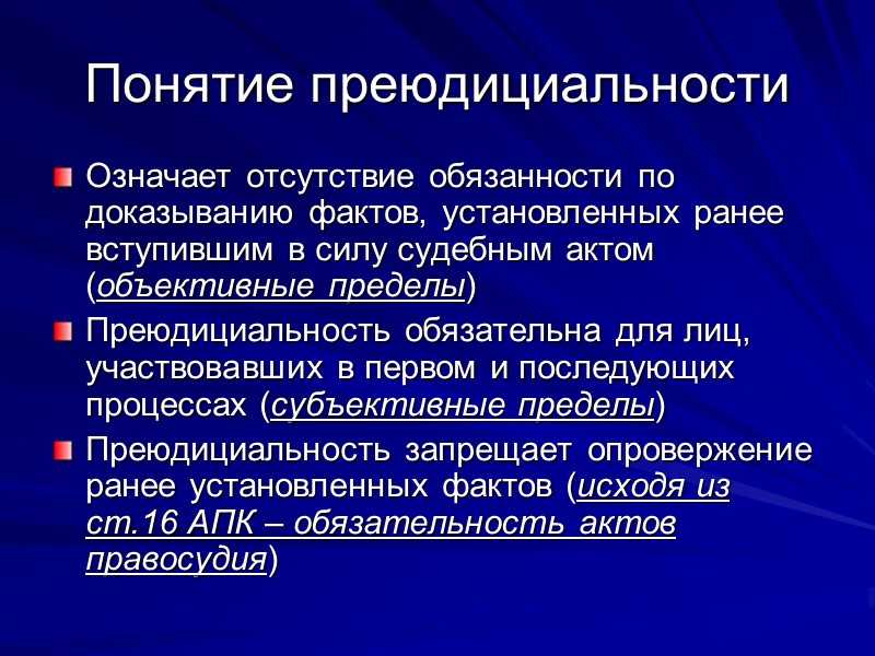 Понятие преюдициальности Означает отсутствие обязанности по доказыванию фактов, установленных ранее вступившим в силу судебным актом (объективные пределы) Преюдициальность обязательна для лиц, участвовавших в первом и последующих процессах (субъективные пределы) Преюдициальность запрещает опровержение ранее установленных фактов (исходя из ст.16 АПК – обязательность актов правосудия)