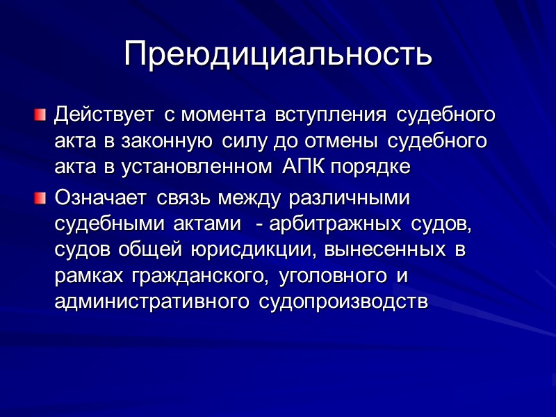 Преюдициальность Действует с момента вступления судебного акта в законную силу до отмены судебного акта в установленном АПК порядке Означает связь между различными судебными актами - арбитражных судов, судов общей юрисдикции, вынесенных в рамках гражданского, уголовного и административного судопроизводств