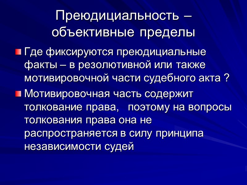 Преюдициальность – объективные пределы Где фиксируются преюдициальные факты – в резолютивной или также мотивировочной части судебного акта ? Мотивировочная часть содержит толкование права, поэтому на вопросы толкования права она не распространяется в силу принципа независимости судей