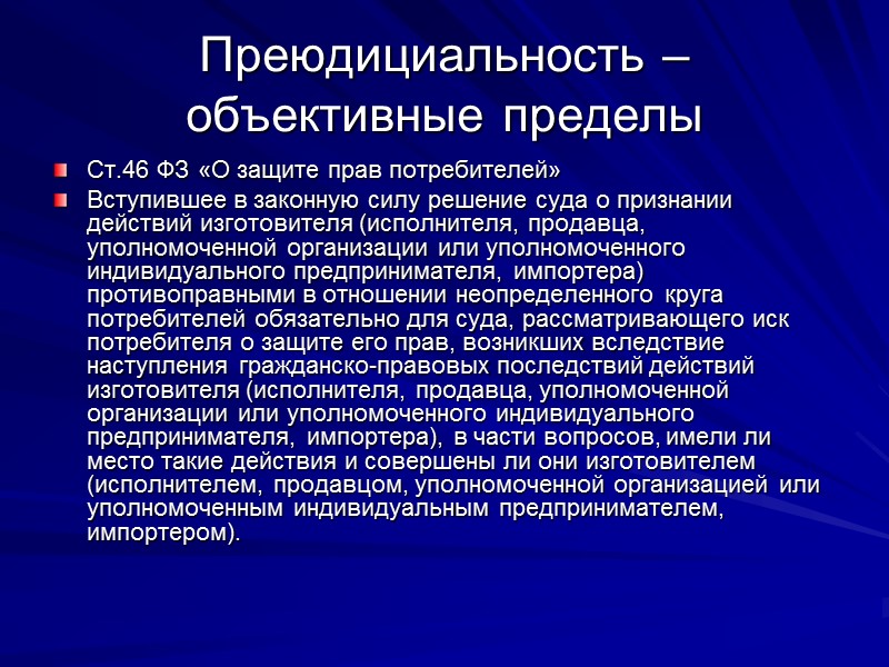 Преюдициальность – объективные пределы Ст.46 ФЗ «О защите прав потребителей» Вступившее в законную силу решение суда о признании действий изготовителя (исполнителя, продавца, уполномоченной организации или уполномоченного индивидуального предпринимателя, импортера) противоправными в отношении неопределенного круга потребителей обязательно для суда, рассматривающего иск потребителя о защите его прав, возникших вследствие наступления гражданско-правовых последствий действий изготовителя (исполнителя, продавца, уполномоченной организации или уполномоченного индивидуального предпринимателя, импортера), в части вопросов, имели ли место такие действия и совершены ли они изготовителем (исполнителем, продавцом, уполномоченной организацией или уполномоченным индивидуальным предпринимателем, импортером).