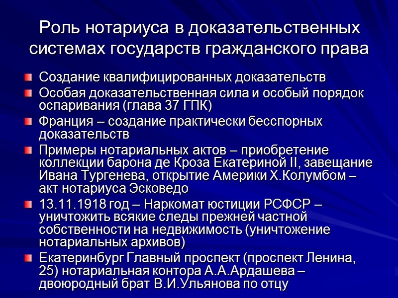 Роль нотариуса в доказательственных системах государств гражданского права Создание квалифицированных доказательств Особая доказательственная сила и особый порядок оспаривания (глава 37 ГПК) Франция – создание практически бесспорных доказательств Примеры нотариальных актов – приобретение коллекции барона де Кроза Екатериной II, завещание Ивана Тургенева, открытие Америки Х.Колумбом – акт нотариуса Эсковедо 13.11.1918 год – Наркомат юстиции РСФСР – уничтожить всякие следы прежней частной собственности на недвижимость (уничтожение нотариальных архивов) Екатеринбург Главный проспект (проспект Ленина, 25) нотариальная контора А.А.Ардашева – двоюродный брат В.И.Ульянова по отцу