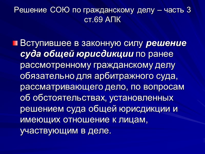 Решение СОЮ по гражданскому делу – часть 3 ст.69 АПК Вступившее в законную силу решение суда общей юрисдикции по ранее рассмотренному гражданскому делу обязательно для арбитражного суда, рассматривающего дело, по вопросам об обстоятельствах, установленных решением суда общей юрисдикции и имеющих отношение к лицам, участвующим в деле.