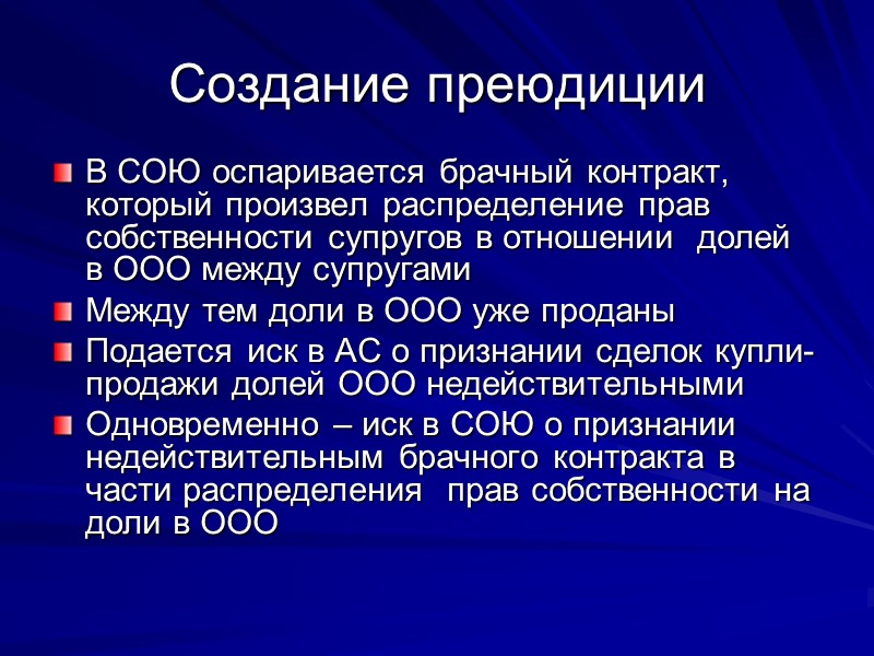Создание преюдиции В СОЮ оспаривается брачный контракт, который произвел распределение прав собственности супругов в отношении долей в ООО между супругами Между тем доли в ООО уже проданы Подается иск в АС о признании сделок купли-продажи долей ООО недействительными Одновременно – иск в СОЮ о признании недействительным брачного контракта в части распределения прав собственности на доли в ООО