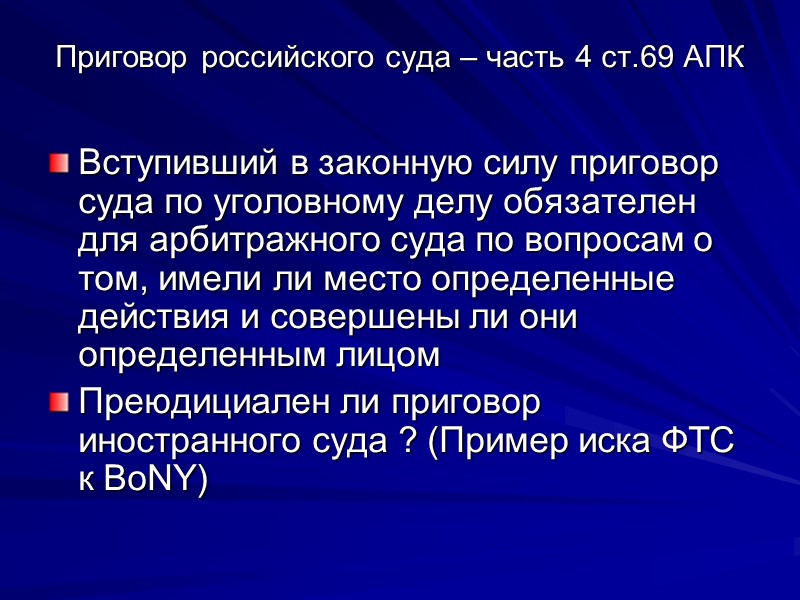 Приговор российского суда – часть 4 ст.69 АПК Вступивший в законную силу приговор суда по уголовному делу обязателен для арбитражного суда по вопросам о том, имели ли место определенные действия и совершены ли они определенным лицом Преюдициален ли приговор иностранного суда ? (Пример иска ФТС к BoNY)