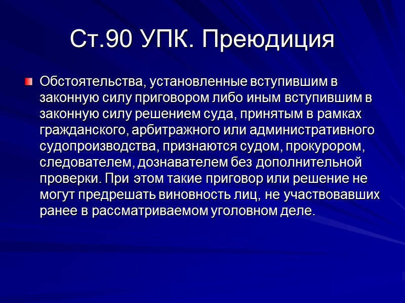 Ст.90 УПК. Преюдиция Обстоятельства, установленные вступившим в законную силу приговором либо иным вступившим в законную силу решением суда, принятым в рамках гражданского, арбитражного или административного судопроизводства, признаются судом, прокурором, следователем, дознавателем без дополнительной проверки. При этом такие приговор или решение не могут предрешать виновность лиц, не участвовавших ранее в рассматриваемом уголовном деле.