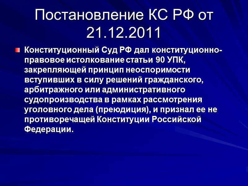 Постановление КС РФ от 21.12.2011 Конституционный Суд РФ дал конституционно-правовое истолкование статьи 90 УПК, закрепляющей принцип неоспоримости вступивших в силу решений гражданского, арбитражного или административного судопроизводства в рамках рассмотрения уголовного дела (преюдиция), и признал ее не противоречащей Конституции Российской Федерации.