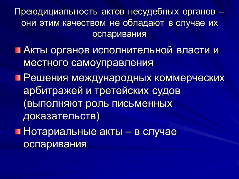 Преюдициальность актов несудебных органов – они этим качеством не обладают в случае их оспаривания Акты органов исполнительной власти и местного самоуправления Решения международных коммерческих арбитражей и третейских судов (выполняют роль письменных доказательств) Нотариальные акты – в случае оспаривания