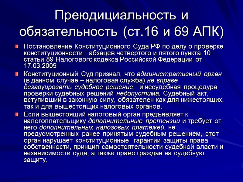 Преюдициальность и обязательность (ст.16 и 69 АПК) Постановление Конституционного Суда РФ по делу о проверке конституционности абзацев четвертого и пятого пункта 10 статьи 89 Налогового кодекса Российской Федерации от 17.03.2009 Конституционный Суд признал, что административный орган (в данном случае – налоговая служба) не вправе дезавуировать судебное решение, и несудебная процедура проверки судебных решений недопустима. Судебный акт, вступивший в законную силу, обязателен как для нижестоящих, так и для вышестоящих налоговых органов. Если вышестоящий налоговый орган предъявляет к налогоплательщику дополнительные претензии и требует от него дополнительных налоговых платежей, не предусмотренных ранее принятым судебным решением, этот орган нарушает конституционные гарантии защиты права собственности, принцип самостоятельности судебной власти и независимости суда, а также право граждан на судебную защиту.