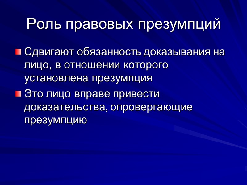 Роль правовых презумпций Сдвигают обязанность доказывания на лицо, в отношении которого установлена презумпция Это лицо вправе привести доказательства, опровергающие презумпцию