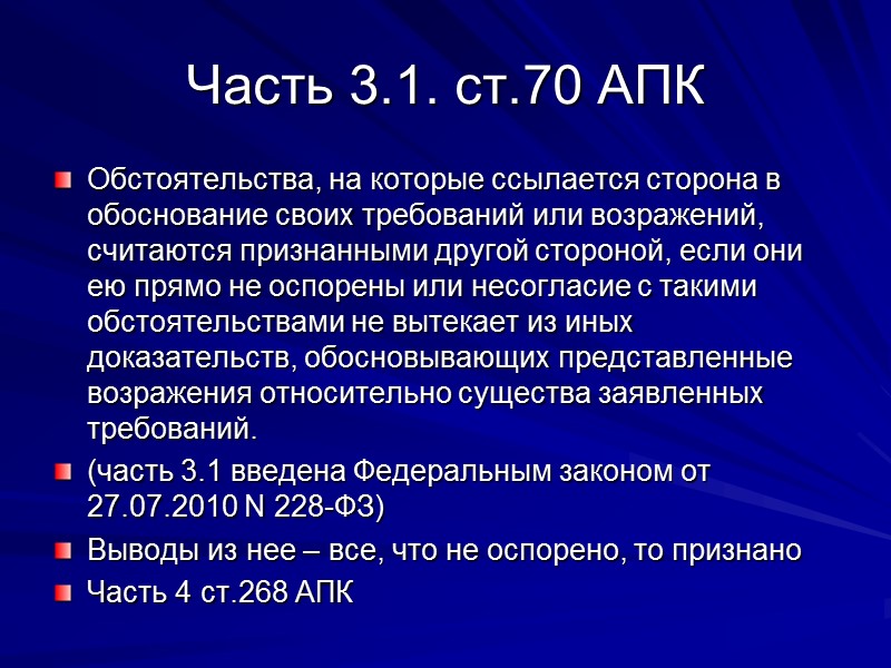 Часть 3.1. ст.70 АПК Обстоятельства, на которые ссылается сторона в обоснование своих требований или возражений, считаются признанными другой стороной, если они ею прямо не оспорены или несогласие с такими обстоятельствами не вытекает из иных доказательств, обосновывающих представленные возражения относительно существа заявленных требований. (часть 3.1 введена Федеральным законом от 27.07.2010 N 228-ФЗ) Выводы из нее – все, что не оспорено, то признано Часть 4 ст.268 АПК