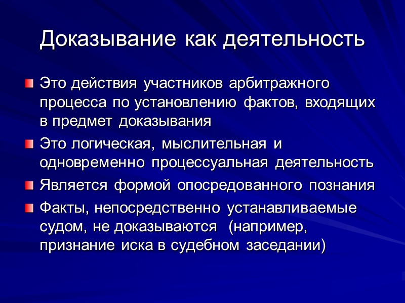 Доказывание как деятельность Это действия участников арбитражного процесса по установлению фактов, входящих в предмет доказывания Это логическая, мыслительная и одновременно процессуальная деятельность Является формой опосредованного познания Факты, непосредственно устанавливаемые судом, не доказываются (например, признание иска в судебном заседании)