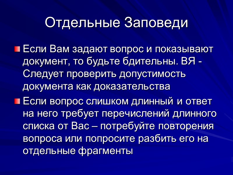Отдельные Заповеди Если Вам задают вопрос и показывают документ, то будьте бдительны. ВЯ - Следует проверить допустимость документа как доказательства Если вопрос слишком длинный и ответ на него требует перечислений длинного списка от Вас – потребуйте повторения вопроса или попросите разбить его на отдельные фрагменты