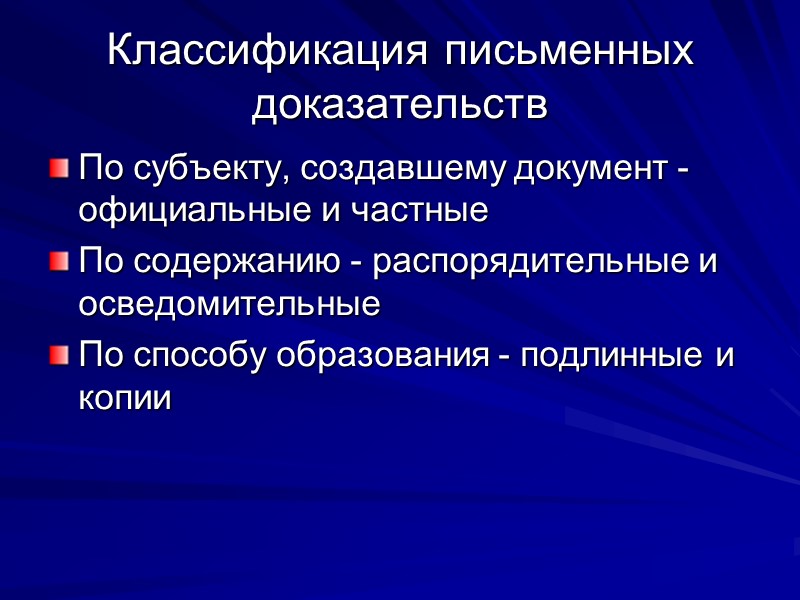 Классификация письменных доказательств По субъекту, создавшему документ - официальные и частные По содержанию - распорядительные и осведомительные По способу образования - подлинные и копии