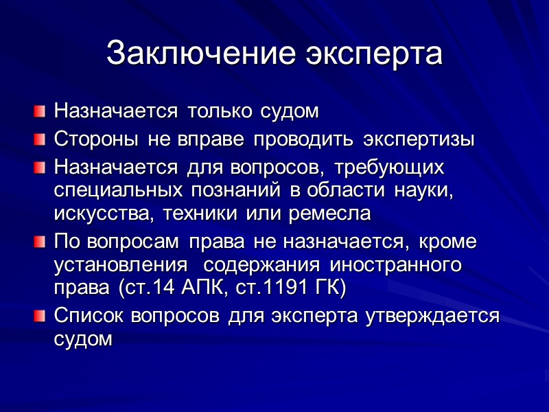 Заключение эксперта Назначается только судом Стороны не вправе проводить экспертизы Назначается для вопросов, требующих специальных познаний в области науки, искусства, техники или ремесла По вопросам права не назначается, кроме установления содержания иностранного права (ст.14 АПК, ст.1191 ГК) Список вопросов для эксперта утверждается судом