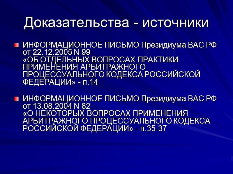 Доказательства - источники ИНФОРМАЦИОННОЕ ПИСЬМО Президиума ВАС РФ от 22.12.2005 N 99 «ОБ ОТДЕЛЬНЫХ ВОПРОСАХ ПРАКТИКИ ПРИМЕНЕНИЯ АРБИТРАЖНОГО ПРОЦЕССУАЛЬНОГО КОДЕКСА РОССИЙСКОЙ ФЕДЕРАЦИИ» - п.14 ИНФОРМАЦИОННОЕ ПИСЬМО Президиума ВАС РФ от 13.08.2004 N 82 «О НЕКОТОРЫХ ВОПРОСАХ ПРИМЕНЕНИЯ АРБИТРАЖНОГО ПРОЦЕССУАЛЬНОГО КОДЕКСА РОССИЙСКОЙ ФЕДЕРАЦИИ» - п.35-37