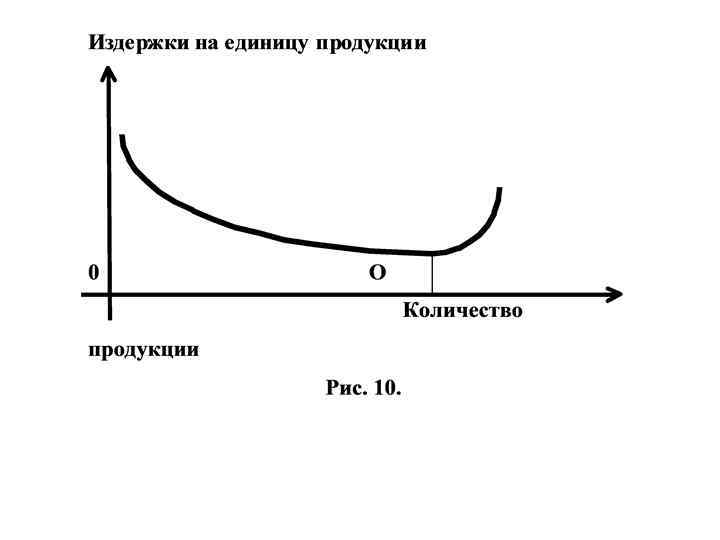Средние переменные издержки • График средних переменных издержек имеет более сложную, U-образную форму (параболы), т. е. сначала средние переменные издержки падают в расчете на единицу продукции, достигают своего минимума в т. О, а затем начинают возрастать. Это происходит вследствие действия закона убывающей отдачи.