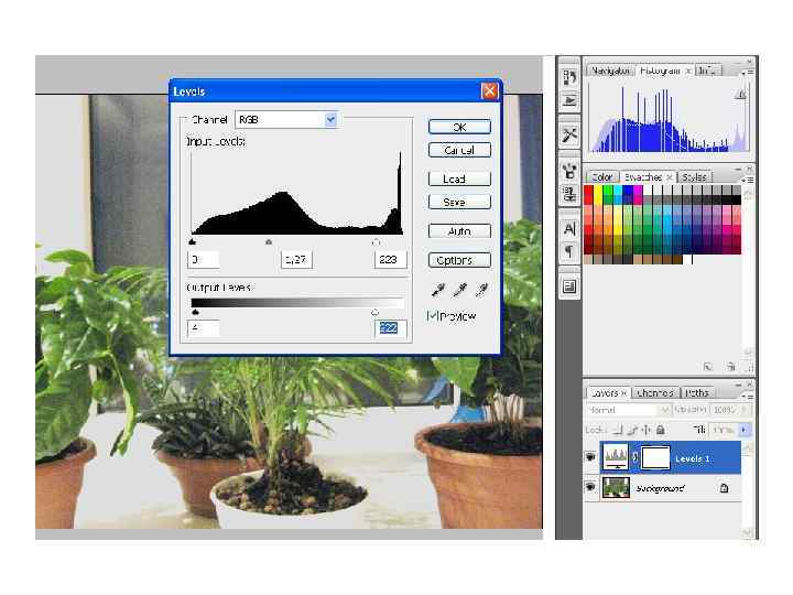 Любые действия, затрагивающие тоновые характеристики изображения, динамически отображаются в этой палитре. Причем она показывает предыдущее состояние распределения и тот баланс тонов, который дает данная операция. Это позволяет контролировать корректирующие действия и выбирать правильное направление работ по тоновой коррекции.