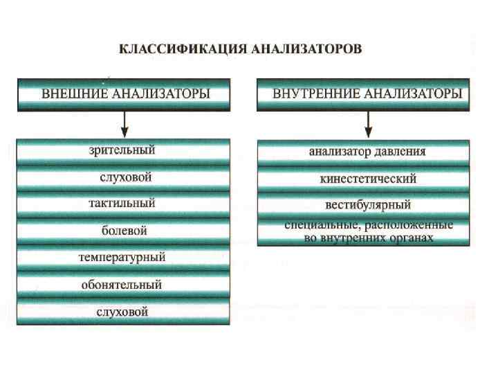 Классификация рецепторов В зависимости от природы раздражителя подразделяются на: механорецепторы (слуховые, вестибулярные, гравитационные, тактильные рецепторы кожи и опорно-двигательного аппарата, барорецепторы сердечно-сосудистой системы); терморецепторы, воспринимающие температурные изменения как внутри организма, так и окружающий организм среде; хеморецепторы, реагирующие на воздействие химических веществ; фоторецепторы, настроенные на восприятие света; болевые рецепторы, т. к. они могут возбуждаться механическими, химическими, электрическими и температурными раздражителями.