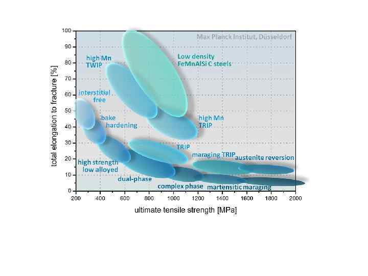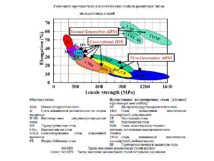 6. 3. 4. Двухфазные феррито-мартенситные стали (Dual phase steels) Как указывалось, для получения высокого однородного удлинения требуется повысить скорость деформационного упрочнения. В обычных крупнозернистых сталях высокого коэффициента деформационного упрочнения и, соответственно, высокого однородного удлинения добиваются путем формирования структур, состоящих из мягкой матрицы и включений твердой фазы. Примером таких структур являются двухфазные феррито-мартенситные стали (ДФМС), широко используемые в автомобилестроении. Автомобильная промышленности требует стали с хорошей штампуемостью (т. е. , с высокой пластичностью), обеспечивающие безопасность пассажиров и минимальный вес кузова (т. е. , с высоким уровнем прочности, хорошей свариваемостью и невысокой ценой (малоуглеродистые низколегированные стали). ДФМС (DP) удовлетворяют этим требования и относятся к первому поколению современных высокопрочных сталей - Advanced High Strength Steels (AHSS). Типичные ДФМС содержат около 0, 1% С, 1 -2% Mn, а также добавки Cr, Mo, Si, увеличивающие прочность и обеспечивающие прокаливаемость стали.