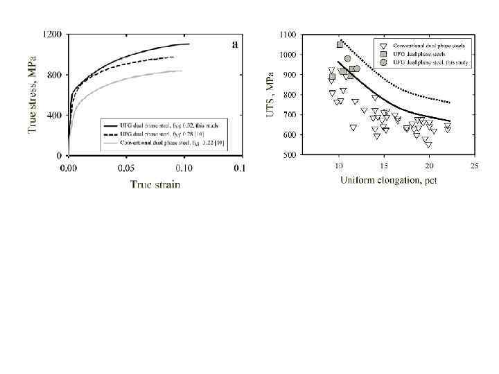 Особенности механических свойств ДФМС: -непрерывное пластическое течение (отсутствие площадки текучести); - очень высокая скорость деформационного упрочнения на начальном этапе деформации; - низкое отношение предела текучести к пределу прочности; - достаточно высокое однородное удлинение Причины: 1. Остаточные напряжения в феррите (растягивающие) и в мартенсите (сжимающие), возникающие в силу объемных изменений при мартенситном превращении, а также подвижные дислокации, зарождающиеся на границе феррит-мартенсит для релаксации упругих напряжений, обусловливают непрерывное течение. 2. Неоднородность распределения деформации между мягким ферритом и твердым мартенситом обусловливает быстрый рост плотности дислокаций в феррите и высокий коэффициент деформационного упрочнения.