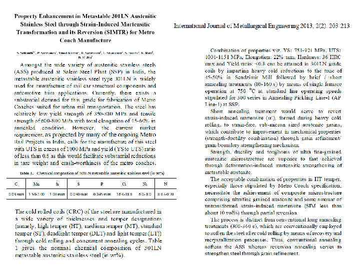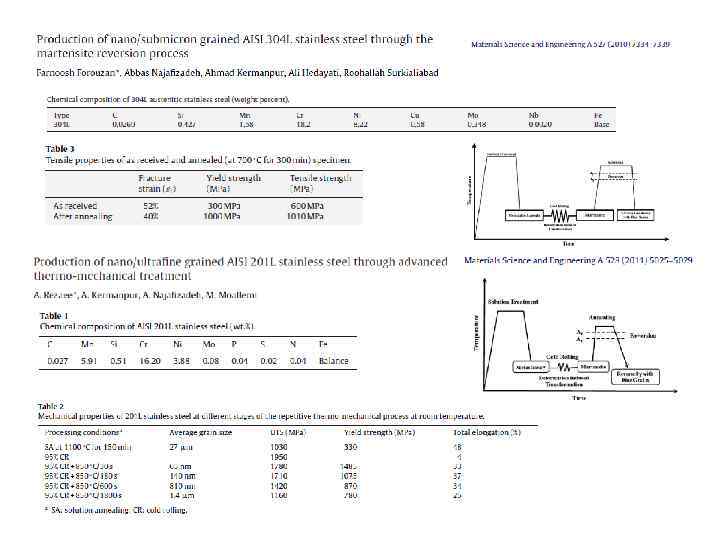 Размер аустенитных зерен после первого отжига – 300 нм Размер аустенитных зерен после второго отжига – 200 нм Получено замечательное сочетание высокой прочности и высокой пластичности. Диаграммы растяжения: (А) после аустенитизации; (B) после первого отжига; (C) после второго отжига Требования к процессу на основе последующих работ: 1) Метастабильный аустенит должен почти полностью испытать превращение в мартенсит в процессе холодной деформации. 2) Мартенсит, индуцированный деформацией, должен быть сам сильно деформирован, чтобы разрушить его реечную структуру перед обратным превращением. 3) Обратное превращение должно быть реализовано при минимальной возможной температуре и за как можно меньшее время, чтобы подавить рост зерен аустенита. 4) Температура начала мартенситного превращения ревертированного аустенита должна быть ниже комнатной температуры, чтобы получить полностью аустенитную структуру.