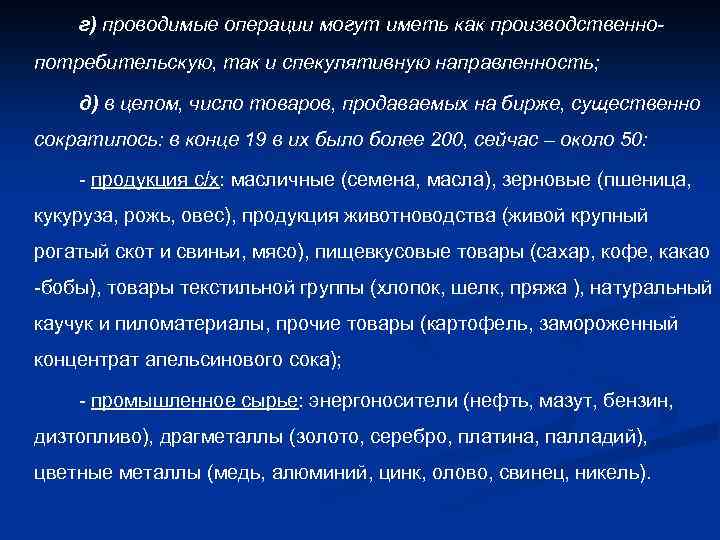 г) проводимые операции могут иметь как производственнопотребительскую, так и спекулятивную направленность; д) в целом, число товаров, продаваемых на бирже, существенно сократилось: в конце 19 в их было более 200, сейчас – около 50: - продукция с/х: масличные (семена, масла), зерновые (пшеница, кукуруза, рожь, овес), продукция животноводства (живой крупный рогатый скот и свиньи, мясо), пищевкусовые товары (сахар, кофе, какао -бобы), товары текстильной группы (хлопок, шелк, пряжа ), натуральный каучук и пиломатериалы, прочие товары (картофель, замороженный концентрат апельсинового сока); - промышленное сырье: энергоносители (нефть, мазут, бензин, дизтопливо), драгметаллы (золото, серебро, платина, палладий), цветные металлы (медь, алюминий, цинк, олово, свинец, никель).