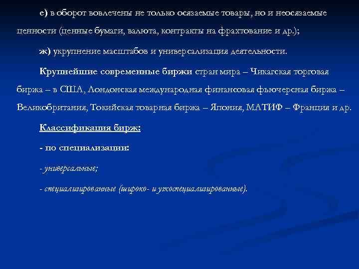 е) в оборот вовлечены не только осязаемые товары, но и неосязаемые ценности (ценные бумаги, валюта, контракты на фрахтование и др. ); ж) укрупнение масштабов и универсализация деятельности. Крупнейшие современные биржи стран мира – Чикагская торговая биржа – в США, Лондонская международная финансовая фьючерсная биржа – Великобритания, Токийская товарная биржа – Япония, МАТИФ – Франция и др. Классификация бирж: - по специализации: - универсальные; - специализированные (широко- и узкоспециализированные).