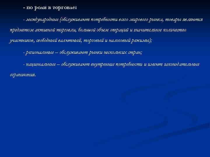 - по роли в торговле: - международные (обслуживают потребности всего мирового рынка, товары являются предметом активной торговли, большой объем операций и значительное количество участников, свободный валютный, торговый и налоговый режимы); - региональные – обслуживают рынки нескольких стран; - национальные – обслуживают внутренние потребности и имеют законодательные ограничения.